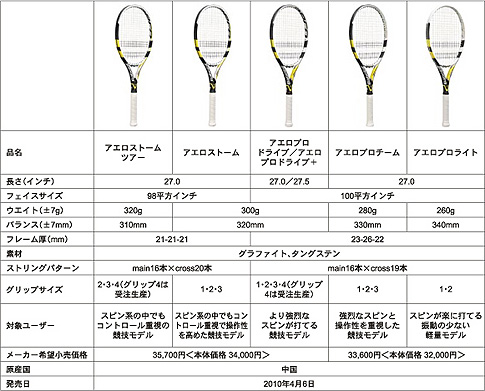 SRIスポーツ(株)は、バボラVS社のテニスラケット「アエロシリーズ」から5機種を、(株)ダンロップスポーツを通じて4月6日から全国一斉に新発売します。メーカー希望小売価格(消費税込み)は、「アエロストームツアー」「アエロストーム」「アエロプロドライブ」が35,700円<本体価格 34,000円>、「アエロプロチーム」「アエロプロライト」が33,600円<本体価格 32,000円>です。 「アエロシリーズ」は、スピン系のテニスラケットで、今回のモデルからグラファイト・タングステン・テクノロジーを採用し、競技志向のプレーヤーニーズに合わせて5機種になって新しく登場しました。コントロール重視のモデルが「アエロストームツアー」、コントロール重視で操作性を高めたモデルが「アエロストーム」、より強烈なスピンが打てるモデルが「アエロプロドライブ」、強烈なスピンと操作性を重視したモデルが「アエロプロチーム」、女性でもスピンが楽に打て振動の少ない軽量のモデルが「アエロプロライト」と、さらに幅広いプレーヤーニーズに対応しました。 ![]()