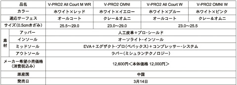 ダンロップスポーツ(株)は、バボラVS社のテニスシューズ「V-PRO2」シリーズを(株)ダンロップスポーツマーケティングを通じて3月14日より新発売します。 このシリーズは多くのバボラの契約プロも使用し、プレーヤーの信頼性の高い競技用テニスシューズです。衝撃吸収性とフィット感を向上し、「V-PRO2 All Court M(オールコート、男性用、カラー:ホワイト×レッド)」、「V-PRO2 All Court W(オールコート、女性用、カラー:ホワイト×ブルー)」、「V-PRO 2 OMNI(オムニ、ユニセックス、カラー:ホワイト×イエロー)」、「V-PRO2 OMNI W(オムニ、女性用、カラー:ホワイト×ピンク)」の4モデルを刷新しました。メーカー希望小売価格(消費税込み)は、いずれも12,600円<本体価格 12,000円>です。 「V-PRO」シリーズは「プロ・シールド」※1や「EVAインソール・ボード」※2などの機能を搭載し、耐久性や快適性などコートパフォーマンスの向上を図ると同時に、競技者が求める適度なフィット感も実現しています。「V-PRO2」シリーズでは、世界のトッププレーヤーも使用する「プロパルス」シリーズの技術を新たに採用し、衝撃吸収性、フィット感を向上しました。国内主要トーナメントにおいて常に高い使用率を誇るとともに、バボラチームも使用するなど世界の競技シーンでも活躍し、高い実績を誇る競技用モデルです。
