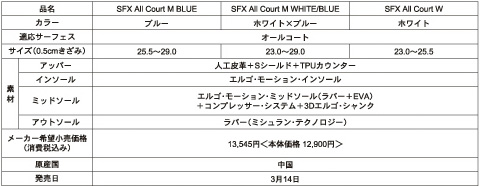 ダンロップスポーツ(株)は、バボラVS社から、人間工学に基づくテクノロジー(エルゴ・モーション・テクノロジー)により、心地よい足入れ感を実現した新しいテニスシューズ「SFX※シリーズ」3機種を(株)ダンロップスポーツマーケティングを通じて3月14日より新発売します。 メーカー希望小売価格(消費税込み)は、「SFX All Court M (オールコート、男性用、カラー:ブルー)」、「SFX All Court M(オールコート、カラー:ホワイト×ブルー)」、「SFX All Court W(オールコート、女性用、カラー:ホワイト)」いずれも13,545円<本体価格 12,900円>です。 ※「SFX」とは、「The Superior Fit Xperience(Experienceの造語)」の略。 心地よいフィット感とコートパフォーマンスを徹底的に追求しました。人間工学に基づいたエルゴ・モーション・テクノロジーにより、コート上のプレーヤーの動きに対し自在に応えてくれる、人に優しいシューズです。競技や一般用途を問わず、履いた瞬間に違いがわかる心地よさが、流れるようなフットワークを可能にします。 ■「SFXシリーズ」の新しいテクノロジー (1)「エルゴ・モーション・ミッドソール」 ミッドソールに2種類の素材を採用し、シューズのダイナミックな特性を向上しました。 足の構造と足の動きに適合した多層構造の高性能インソールを採用しました。 人間工学に基づいた3Dシャンクを搭載しました。横方向への動きに対する安定性を強化しました。