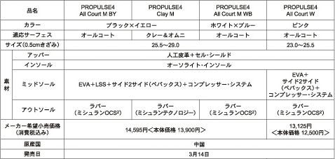 ネジレに対する高い強度を発揮する2イン1シャンクを搭載しました。バケットシートのように足をしっかりサポートし、急激な切り替えし時の負荷を軽減し、安定性を高めました。 (4)耐久性とフィット感を向上した「新アッパーパターン」 「セル・シールド」のデザインを最適化し、最も通気性が求められる部分の耐久性を強化しました。さらにアッパーの足首部分をかかとに適合するように非対象化し、サポート性とフィット感を向上しました。 (5)女性用モデルのために、女性の足に基づいたラスト設計をした「専用テクノロジー」 アッパーやフットベルトに女性専用のテクノロジー※2を採用し、同時に軽量化も実現しました。 ※2:女性専用のテクノロジー(「PROPULSE4 All Court W」にのみ採用) ・アッパーをシームレス構造にするとともに、柔軟性に優れた「ソフト・シールド」を採用。伸縮性と通気性を高め、軽量化を実現しました。 ・軽量タイプのフットベルトを採用し、フィット感のカスタマイズが可能になりました。 ・「LSS」をベースに、女性向けに軽量化したシャンクを搭載することで、フットワークのサポート性と安定性を向上しました。 ■「PROPULSE4」シリーズの概要 以上