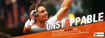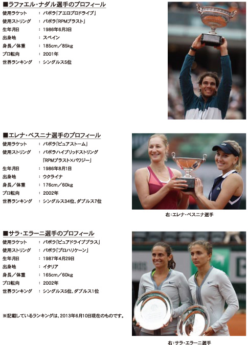 ダンロップスポーツ(株)が、(株)ダンロップスポーツマーケティングを通じて販売しているバボラのテニスラケット「アエロプロドライブ」を使用しているラファエル・ナダル選手(スペイン)と、「ピュアストーム」を使用しているエレナ・ベスニナ選手(ロシア)が、テニスの4大大会である全仏オープン(パリ:ローランギャロス)の男子シングルスと女子ダブルスで優勝しました。また、サラ・エラーニ選手(イタリア)が女子ダブルスで準優勝しました。 男子シングルス決勝戦では、ラファエル・ナダル選手(スペイン)がダビド・フェレール選手(スペイン)に6-3、6-2、6-3のスコアで勝利、優勝しました。この優勝により、自身の全仏最多優勝記録を更新し、過去最多となる前人未到の8勝目を達成しました。男子で同一4大大会8勝目は初です。 一方、女子ダブルス決勝戦では、エレナ・ベスニナ選手(ロシア)が、サラ・エラーニ(イタリア)・ロベルタ・ヴィンチ(イタリア)組を7-5、6-2で下し、4大大会初優勝を飾りました。 ![]()