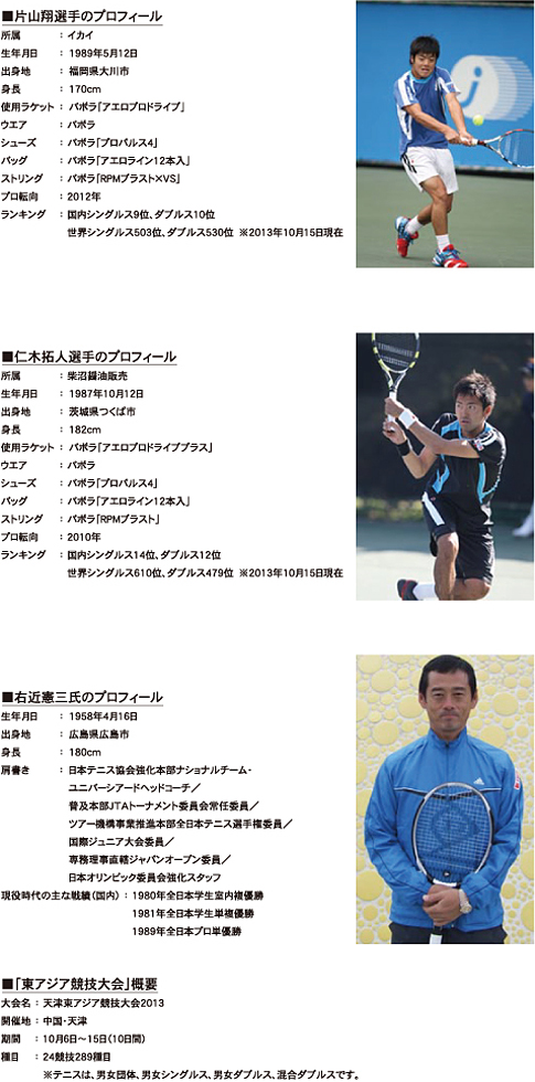 10月6日から開催されていた「天津東アジア競技大会2013」に、ダンロップスポーツ(株)の販売会社である(株)ダンロップスポーツマーケティングとバボラのテニス用品使用契約をしている片山翔選手が男子シングルスで金メダル、男子ダブルスで銅メダルを獲得しました。 また、混合ダブルスに出場していた仁木拓人選手(バボラのテニス用品使用契約)が、銅メダルを獲得、そして両選手が出場した男子団体でも銅メダルを獲得しました。本大会の監督は、当社アドバイザリースタッフの右近憲三氏です。