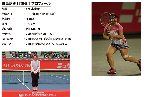 11月9日、「第88回ニッケ全日本テニス選手権大会」女子シングルス決勝後、(株)ダンロップスポーツマーケティングが用品使用契約を結んでいる、昨年の全日本選手権覇者、高雄恵利加選手の引退セレモニーが行われました。 高雄恵利加選手は、ジュニア時代から日本のトップ選手として活躍し、2005年2月にプロ転向、全盛期は世界ランキング最高128位までのぼりつめ、四大大会の予選にもすべて出場しました。2007年初めてフェドカップに出場し、日本代表としても活躍しました。また、全日本選手権では、シングルスで2006年に優勝し、怪我を乗り越え6年のブランクを経て再び昨年優勝を果たすと同時に、ミックスダブルスも優勝、2冠を達成しています。今後の活動に関しては未定ですが「今はゆっくり休みたい」と話しています。 ![]() 以上 |